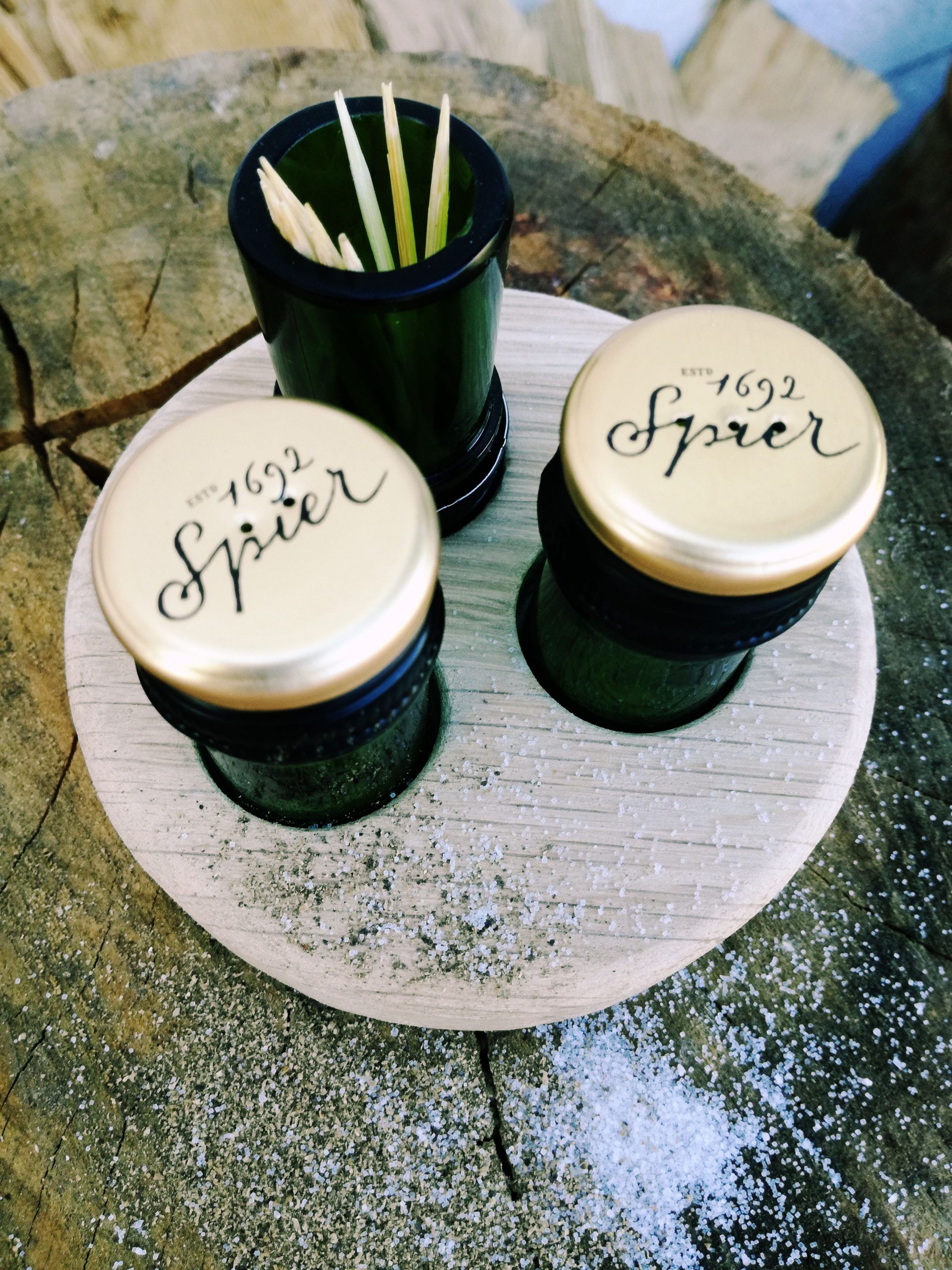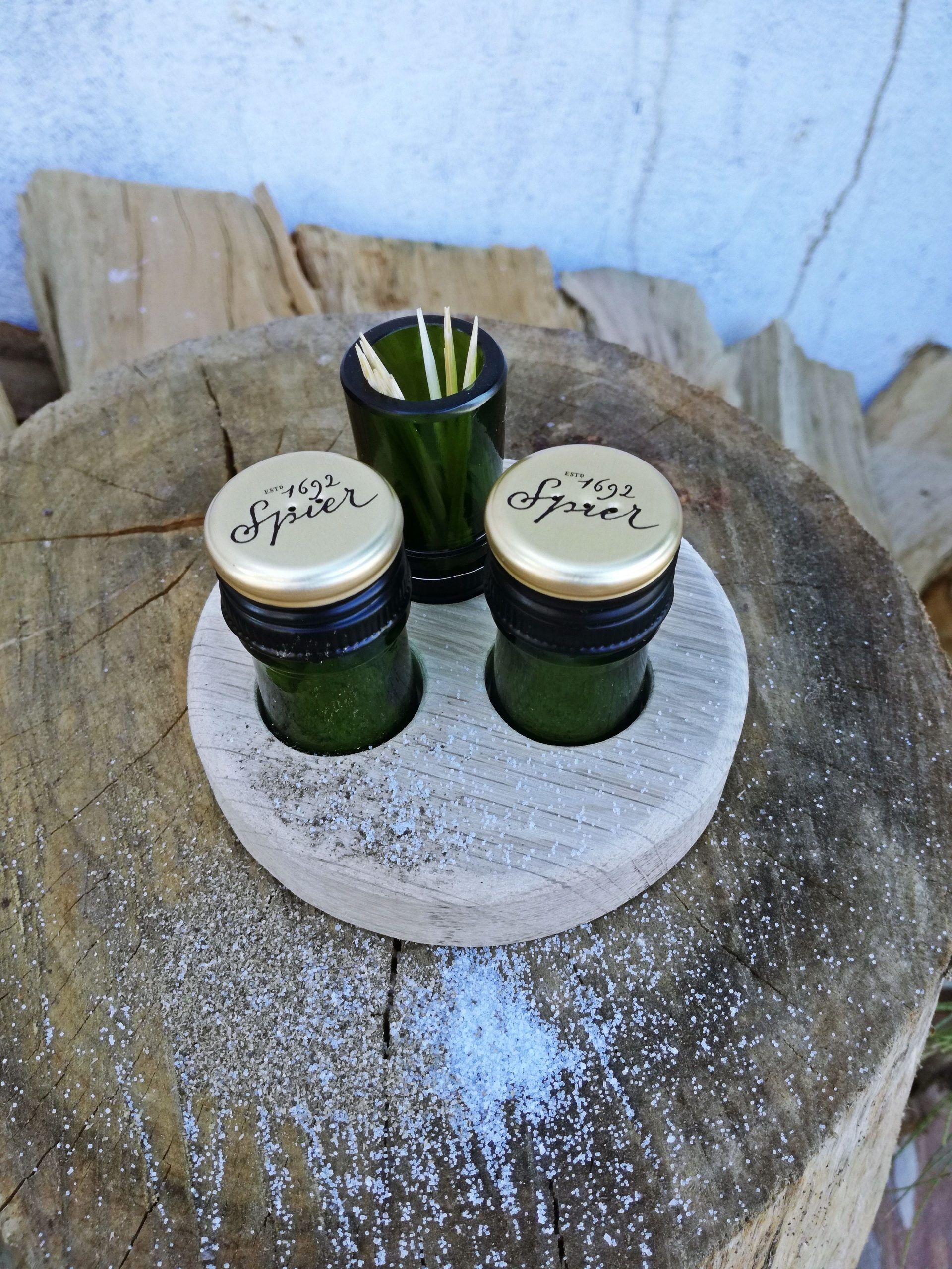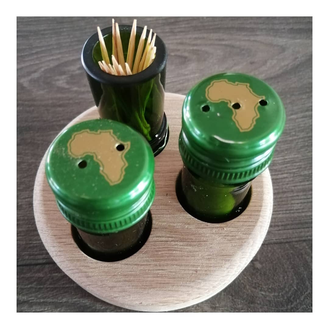I used to be a wine bottle! We live in wine country and it is consumed at leisure on many occasions. With the result that wine bottles flood our waste bins. This cute trio is the perfect accompaniment to your dinner table. It is a Salt & Pepper Shaker and a Toothpick holder on a wooden tray. Made using bottle necks and discarded wood.